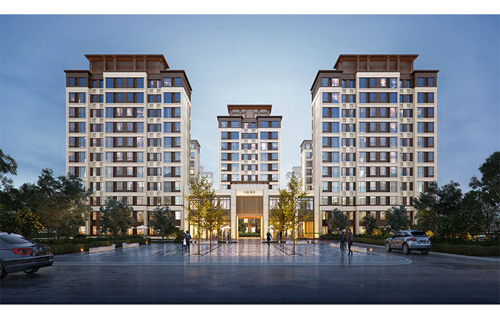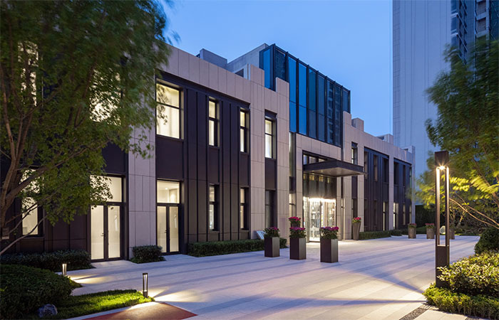 建筑立面整體風格以“典雅”的現(xiàn)代主義氣質為主,為了保證鮮明的層次感,采用了米黃色石材、真石漆和淺灰色金屬、金屬漆四種材質,通過選材和構造設計,在極簡的基調中塑造動人的完整性。整體以框架結合簡潔的橫向線條的形式構成,整體效果簡潔典雅。