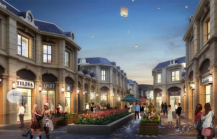 規(guī)劃布局南高北低,風(fēng)情商業(yè)街區(qū)與高層之間以中央巨大的城市開放公園有機(jī)連接,從橫向和縱向雙重尺度與城市進(jìn)行對(duì)話,為城市帶來(lái)活力的城市空間。高層立面采用端莊典雅的法式風(fēng)格,主體采用米黃色真石漆外飾面,基座采用淺咖色石材,與藍(lán)色屋頂?shù)南嘟Y(jié)合,輔以弧形開窗,法式雕花。低層商業(yè)街同樣采用經(jīng)典的法式風(fēng)格,歐式的線腳,弧形的門窗,法式的欄桿,藍(lán)色瓦屋面,展現(xiàn)出濃濃的法式韻味。商業(yè)街建筑的高低錯(cuò)落,結(jié)合靈動(dòng)的商業(yè)流線,營(yíng)造出充滿活力的商業(yè)氣息。