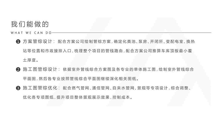 方案管綜設(shè)計(jì):配合方案公司繪制管綜方案,確定化糞池、泵房、開閉所、變配電室、換熱站等位置和市政接排入口,梳理整個(gè)項(xiàng)目的管線路由,配合方案公司推算車庫頂板最小覆土厚度。