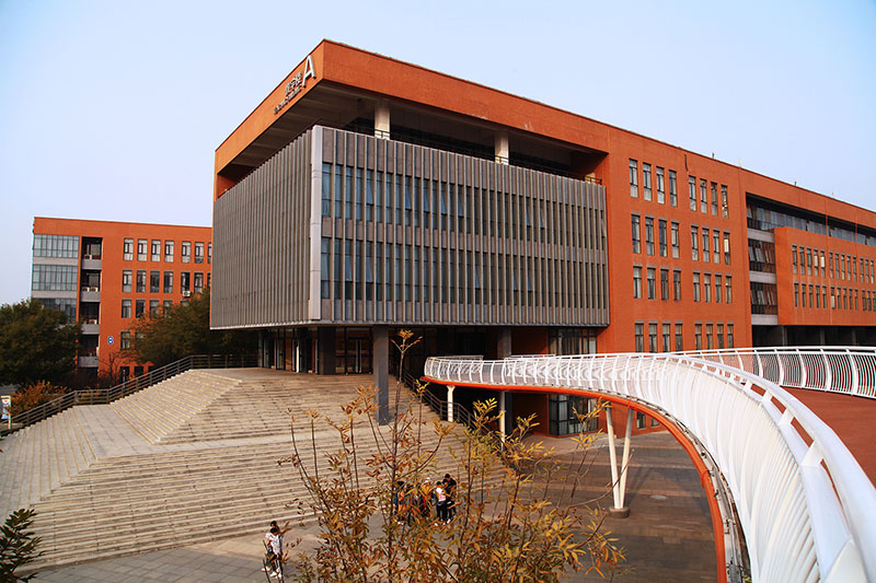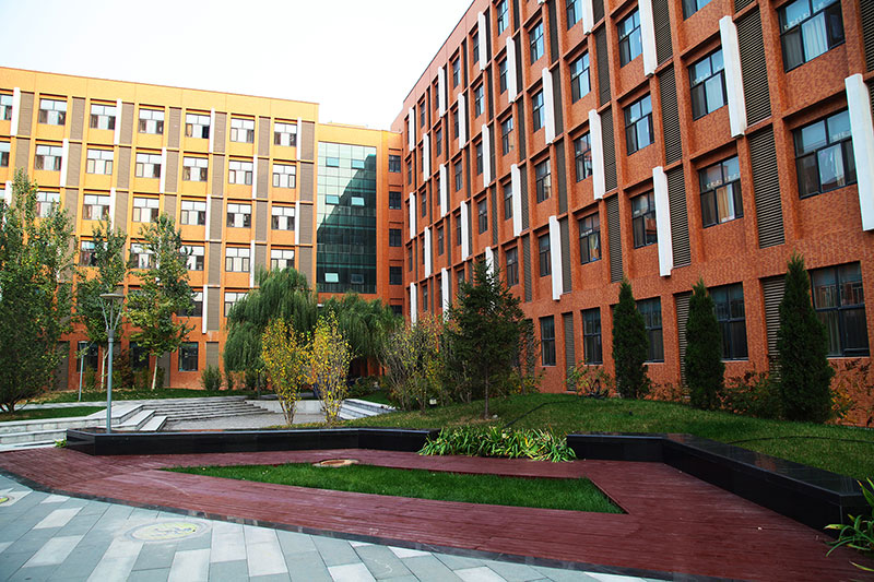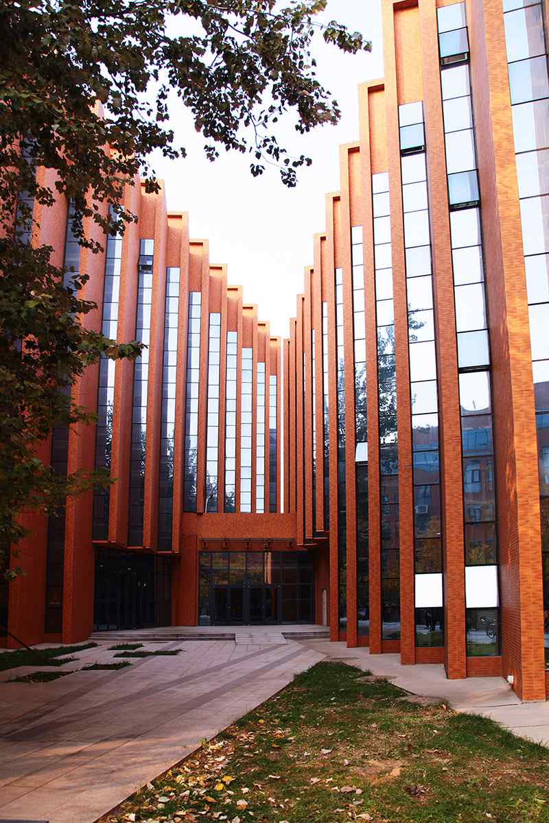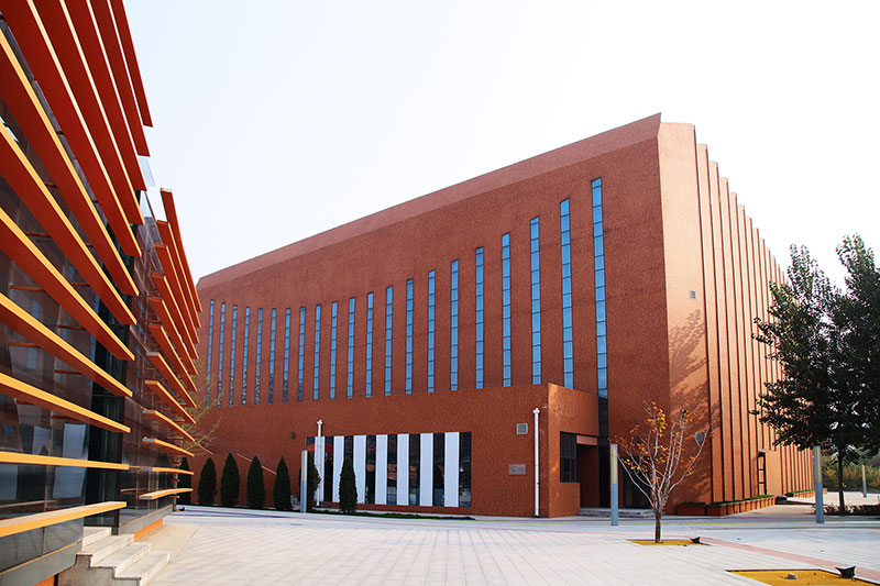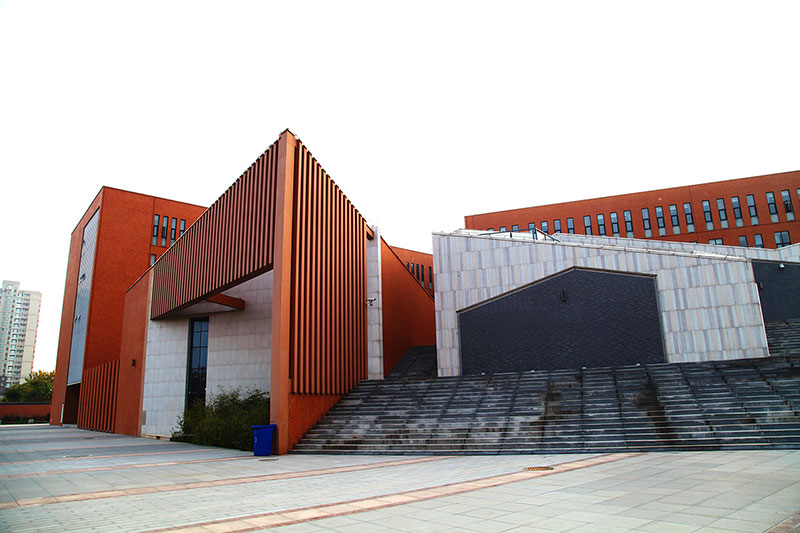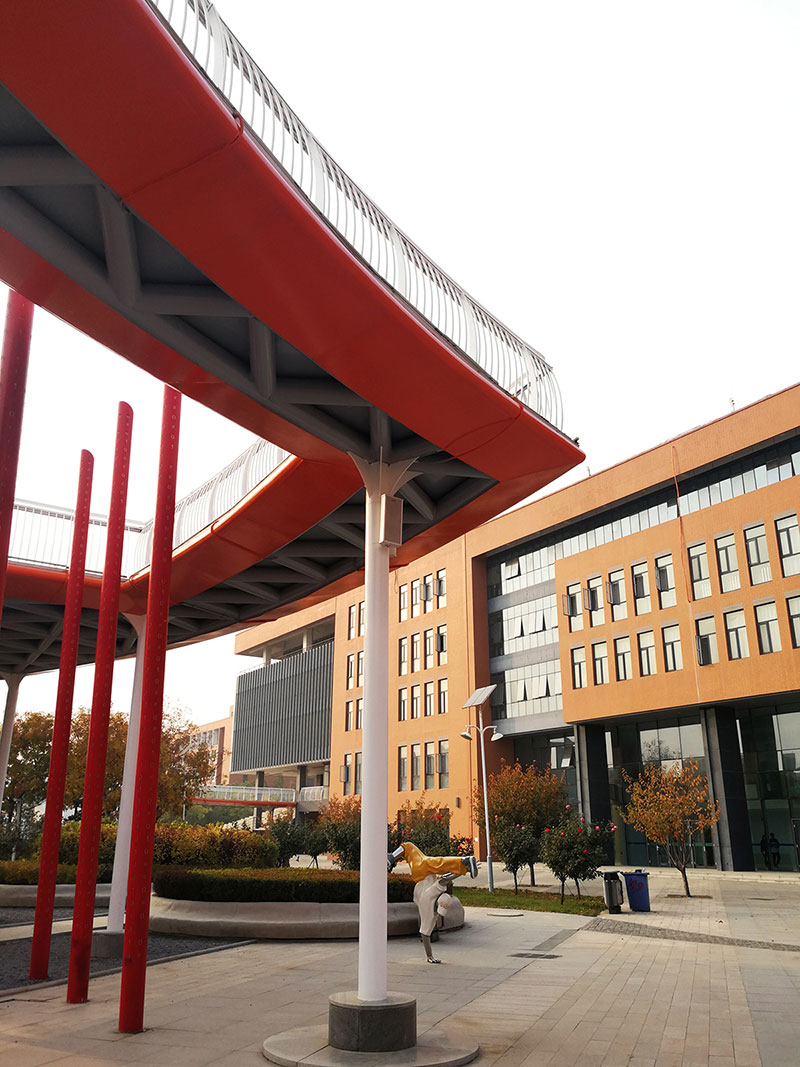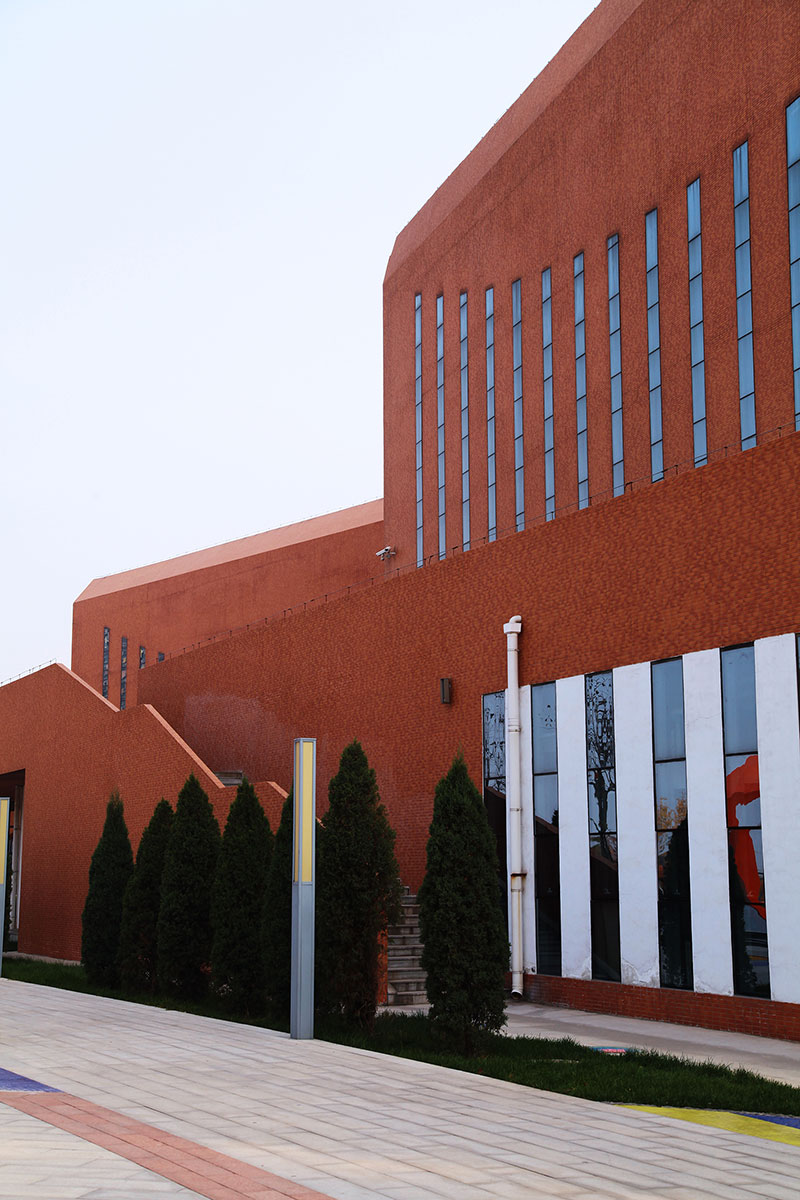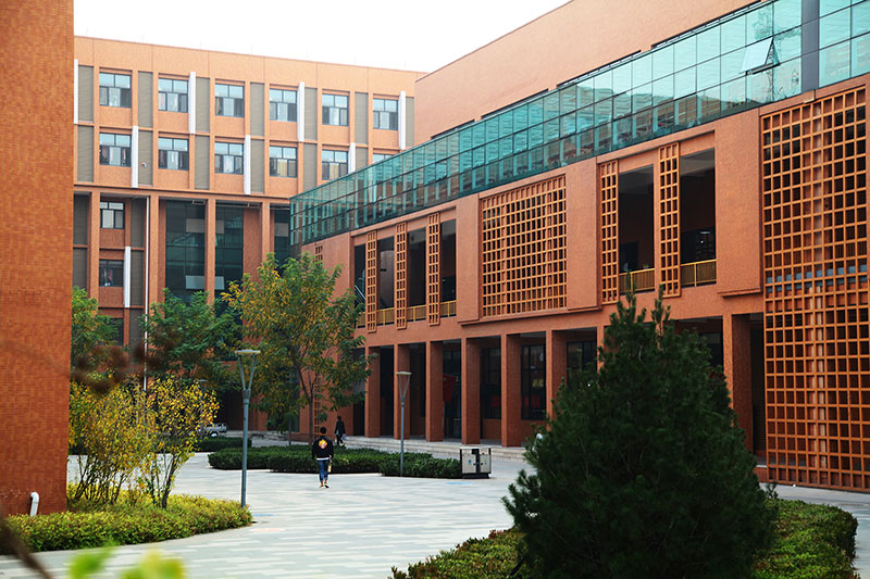 立面采用校園常用的紅磚手法,搭配鋼架及藍色玻璃幕,將傳統(tǒng)與現(xiàn)代相互結合,在給學生帶來濃厚傳統(tǒng)底蘊的同時又不失現(xiàn)代創(chuàng)新的文化氣息。