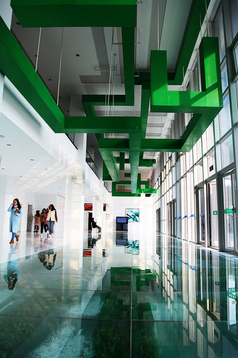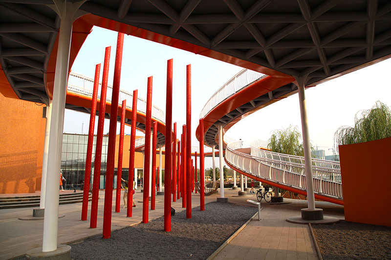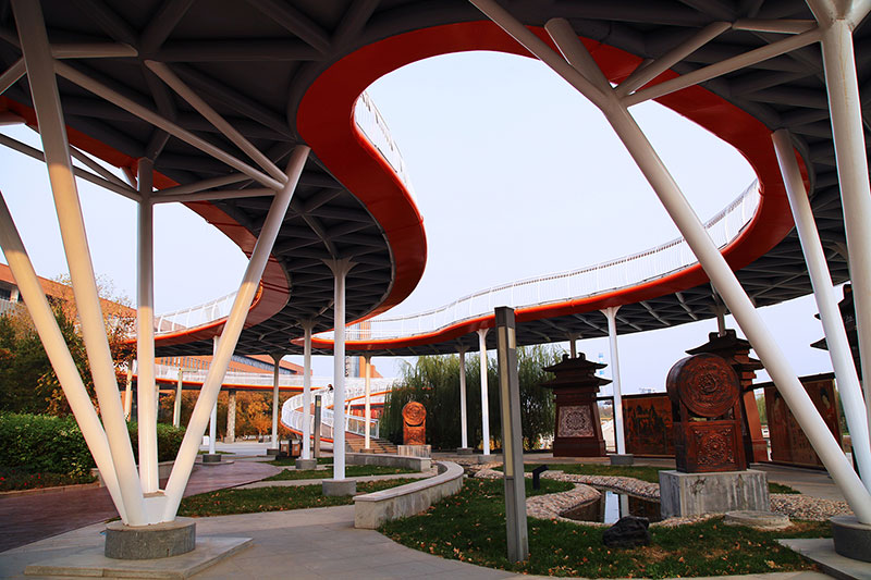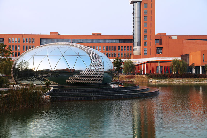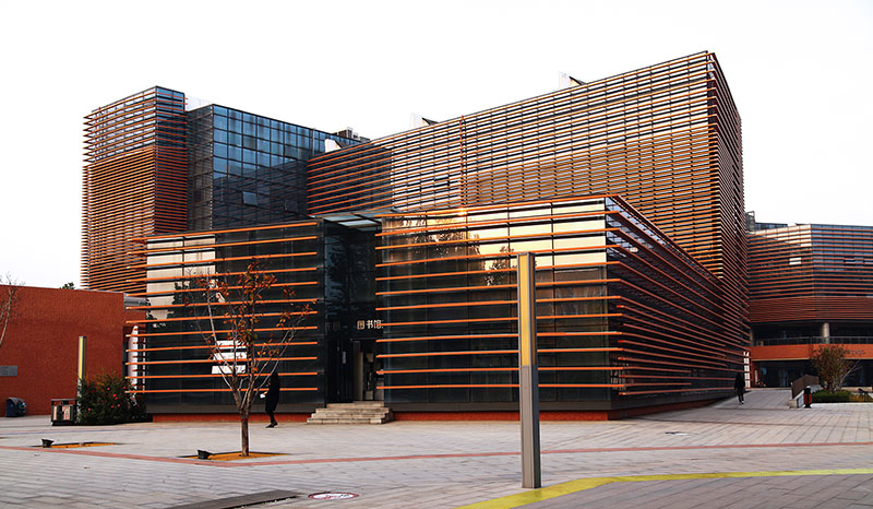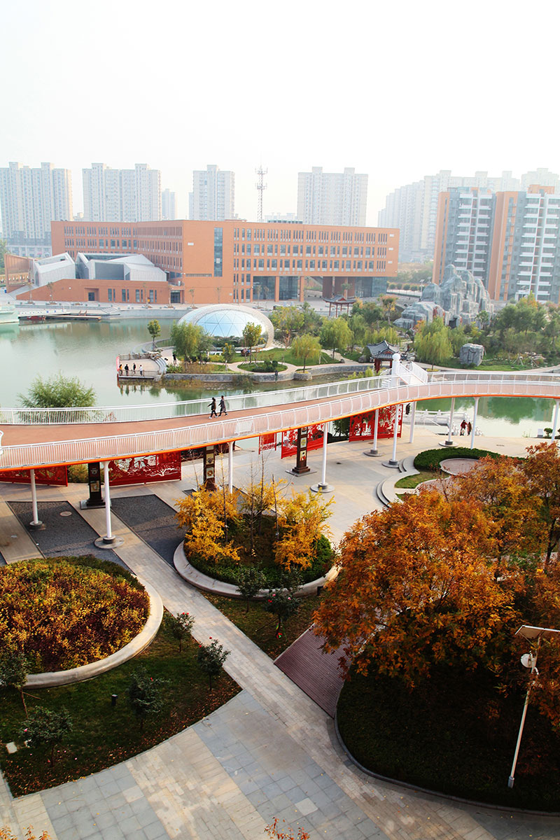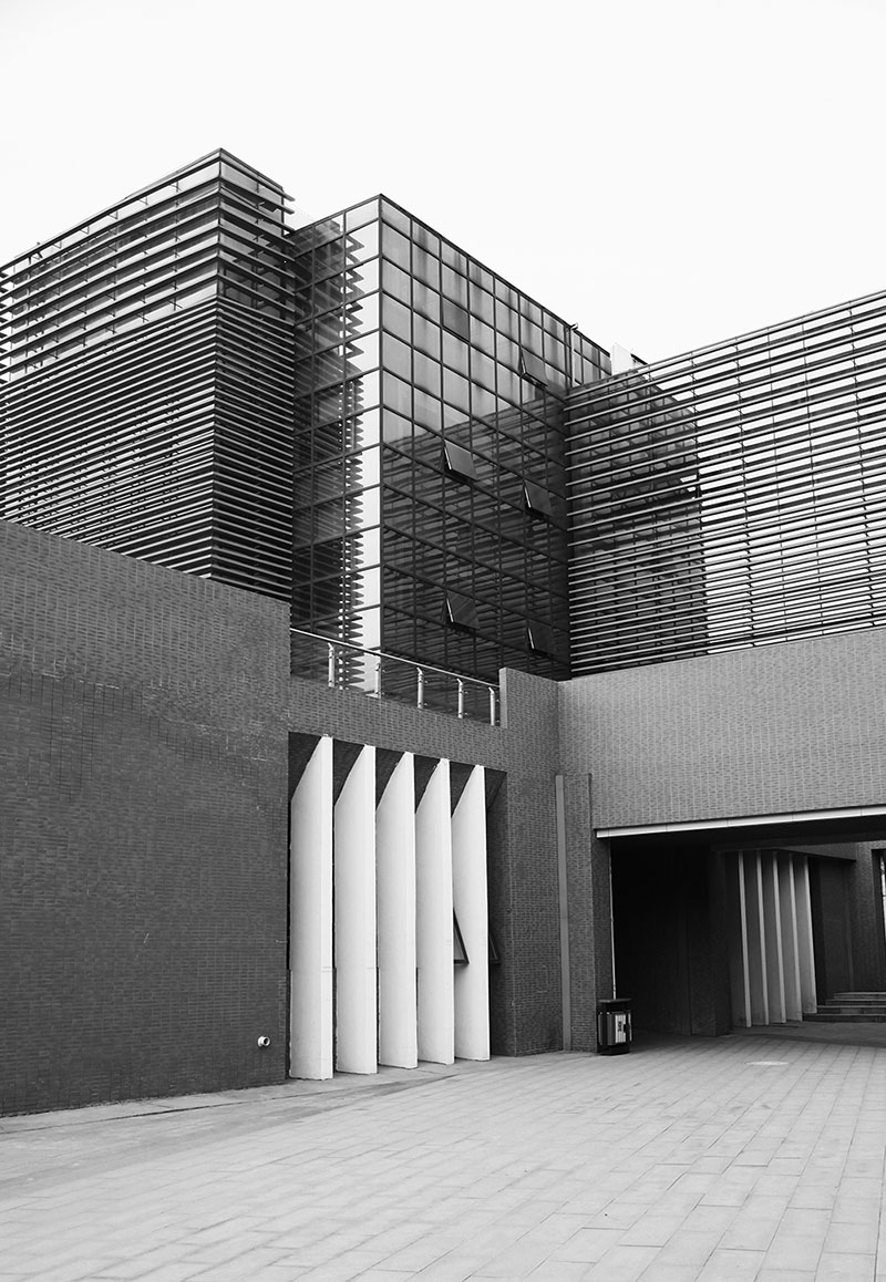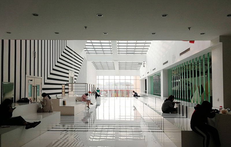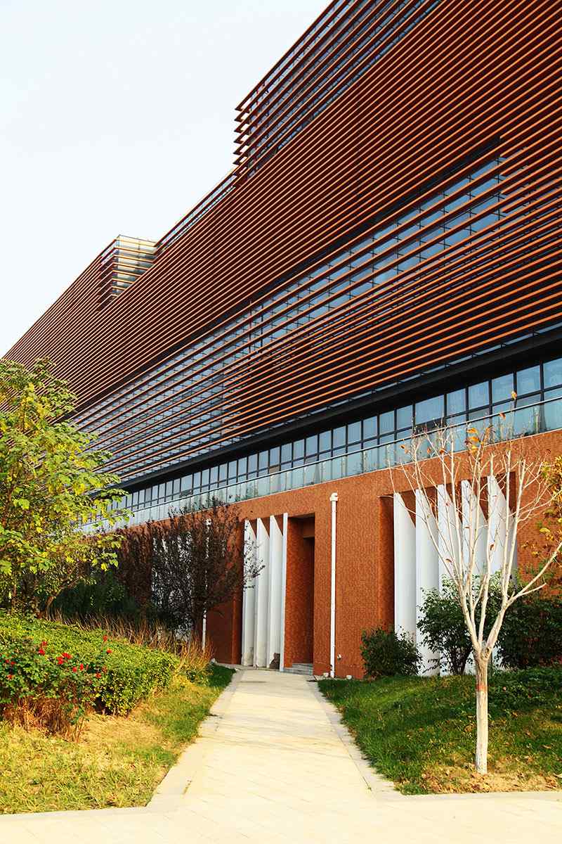 從整體規(guī)劃布局上看,校園內各樓排布張弛有度,建筑與景觀相互結合,中央大湖與景觀廊架搭配蜿蜒蜷曲的步道,平靜中孕育詩意,給一所沉穩(wěn)的文化建筑帶來靈動的韻律之美。