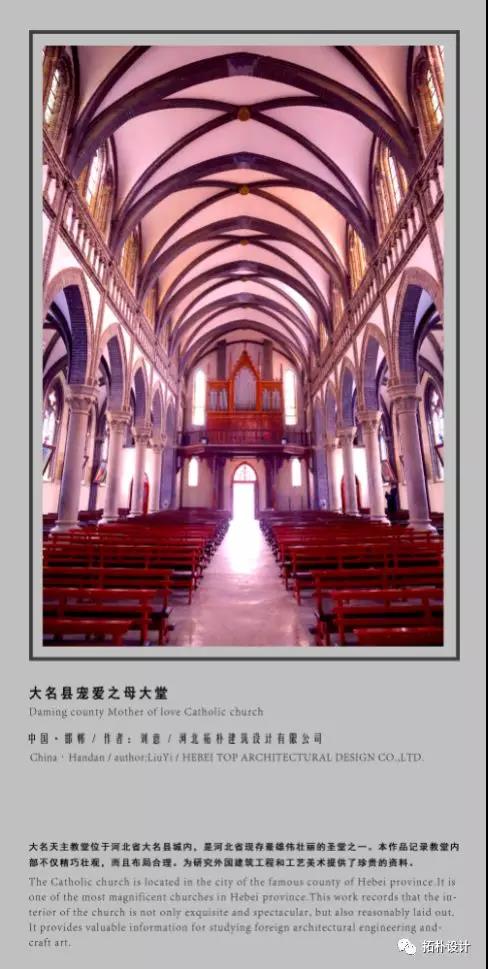 大名天主教堂位于河北省大名縣城內(nèi),是河北省現(xiàn)存最雄偉壯麗的圣堂之一。本作品記錄教堂內(nèi)部不僅精巧壯觀,而且布局合理。為研究外國建筑工程和工藝美術(shù)提供了珍貴的資料。
