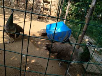 籠中的孔雀可以喂,隨手摘片草葉,孔雀就會(huì)過(guò)來(lái)吃,公孔雀在房間內(nèi)不出來(lái),不知道是怕熱還是在守護(hù)可愛的、剛孵出來(lái)的小孔雀?